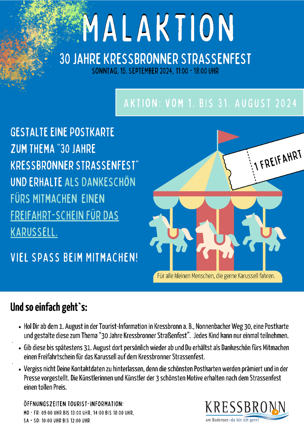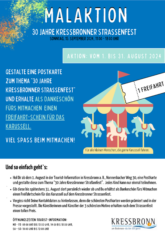 Zur 30. Auflage des Kressbronner Straßenfestes gibt es für Kinder eine Malaktion. Unter dem Motto „Gestalte eine Postkarte zum Thema 30 Jahre Kressbronner Strassenfest“ dürfen sich Kinder in der Tourist Information im Bahnhof eine Blanko-Postkarte holen, diese gestalten und dort auch wieder abgeben und erhalten dafür ein Freiticket für eine Fahrt auf dem Karussell beim Straßenfest. Die schönsten Exemplare werden prämiert. Die Aktion läuft noch bis zum 31. August – also schnell vorbeikommen und mitmachen.