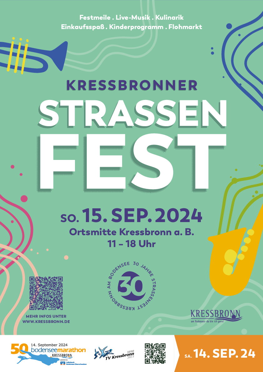 Am Sonntag, den 15. September 2024 feiert Kressbronn a. B. das 30. Kressbronner Straßenfest. Ein Fest, welches weit über die Grenzen der Gemeinde beliebt ist und zu den Höhepunkten im Veranstaltungskalender in der Bodenseeregion zählt. 30 Jahre Straßenfest – das zeigt, wie stark die Verbundenheit der Kressbronner mit ihrer Heimat und wie groß das Engagement der lokalen Vereine und Organisationen ist, aber auch wie leistungsstark und vielseitig die teilnehmenden Kressbronner Betriebe sind. In der Ortsmitte wird es an diesem Tag von 11:00 bis 18:00 Uhr bunt, fröhlich und gesellig. Es wird ein Tag, der zum Genießen und Verweilen einlädt, der kulinarisch und musikalisch wieder viel zu bieten hat und einen schönen Rahmen für ein großartiges Fest bietet. Auf der großen Bühne am Rathausplatz treten die Salty Slickers, Thin Mother, John Leon & Band sowie Lakeside auf und vor der Kressbronner Festhalle unterhält der Musikverein Kressbronn e. V. wieder mit einem stimmungsvollen und vielseitigen Programm.