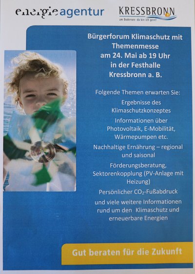 Am 24. Mai findet ab 19 Uhr ein Bürgerforum Klimaschutz mit Themenmesse statt. Alle Bürgerinnen und Bürger, die sich für erneuerbare Energien, Klimaschutz und Möglichkeiten für die Reduzierung des CO2-Ausstoßes interessieren, sind herzlich eingeladen. Bei dem Bürgerforum wird über die Ergebnisse des Klimaschutzkonzeptes Kressbronn a. B., Photovoltaik, E-Mobilität, Wärmepumpen, nachhaltige Ernährung – regional und saisonal -, Fördermöglichkeiten, Umstellung von Heizungsanlagen und vieles mehr rund um den Klimaschutz und erneuerbare Energien informiert. Auch besteht die Möglichkeit, einen persönlichen CO2-Fußabdruck zu ermitteln.
