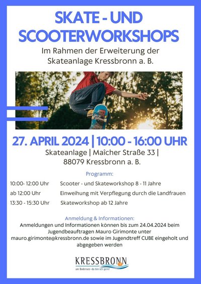 Im Rahmen des Skate-Contests im vergangenen Jahr kamen einige Jugendliche auf die Gemeinde zu und brachten Ideen zur Modernisierung ein. Gemeinsam mit den Jugendlichen und mit Unterstützung von Olli Blender, LIMO Boards, wurde darauf die Erweiterung der Skate-Anlage geplant und erfolgreich umgesetzt. Einige Jugendliche haben bei Wind und Regen die Skate-Anlage um sechs Elemente erweitert und einen Sonnenpavillon aufgebaut, der den Skaterinnen und Skater im Sommer eine Pause im Schatten ermöglichen soll. Die Gemeinde dankt den engagierten Jugendlichen herzlich für ihre Unterstützung, ohne die das Projekt so nicht hätte realisiert werden können. Selbstverständlich gibt es nun auch ein kleines Einweihungsfest. Hierzu lädt die Gemeinde Kressbronn a. B. alle Interessierten am 27. April zur Skate-Anlage ein. Neben dem freien Fahren, guter Musik und leckerem Essen gibt es auch die Möglichkeit, an einem Workshop teilzunehmen.