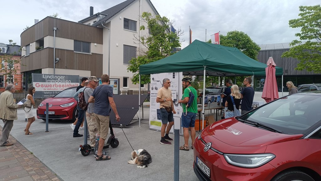 Der erste Solartag der PV-Scouts von Kressbronn a. B. mit einem Solarspaziergang im Schlupfenbuch und einer Ausstellung von Balkonkraftwerken war ein voller Erfolg. Beim Solarspaziergang konnten zwei PV-Scouts ca. 15 Bürger und zwei Vertreter des Regionalwerkes begrüßen. Nach kurzer Einführung zu den Aufgaben der PV-Scouts, dem Ablauf einer typischen PV-Beratung, der Erklärung aus welchen Bauteilen eine Solaranlage besteht und was zusätzlich optional angeschlossen werden kann, erläuterten die Vertreter des Regionalwerks die geplanten Investitionen in den Ausbau des Stromnetzes, die Ausrollung der Zweirichtungs-Stromzähler und das inzwischen vereinfachte und beschleunigte Verfahren zur Anmeldung von Solaranlagen. Beim Solarspaziergang wurde dann deutlich, dass auf vielen Dächern bereits Solaranlagen vorhanden sind und die Teilnehmer konnten acht verschiedene Anlagen unterschiedlichen Alters, mit und ohne Stromspeicher, mit gekoppelter Warmwassererzeugung, Gebäudeheizung und Wallboxen für die Elektromobilität besichtigen. Bei zwei Anlagen wurden die Teilnehmer direkt von den Eigentümern informiert und staunten, dass die Montage von Solarmodulen inzwischen auch auf der Nordseite von Dächern sinnvoll sein kann. Auf besonderes Interesse stieß auch das von der Firma Biggel bereitgestellte Elektroauto. Thomas Biggel erläuterte, wie man ein Elektrofahrzeug dank intelligenter Wallbox mit dem selbst erzeugten Solarstrom laden kann. Nach zwei interessanten Stunden endete der Solarspaziergang und die meisten Teilnehmer gingen zum Vorplatz der Festhalle, um sich die Ausstellung von Balkonkraftwerken anzusehen und sich beraten zu lassen. Interessant war es zu erfahren, dass die neuen Regelungen für Balkonkraftwerke die Installation von PV-Modulen bis zu 2000 Watt, eine erhöhte maximale Einspeisung ins Netz von 800 Watt ermöglichen und dass die Mehrwertsteuerreduzierung um 19 %, die seit dem 01.01.2023 gilt, auch weiterhin Bestand haben wird. Elektrische Heizschlangen, die in bestehende Warmwasserbehälter montiert werden und auch von einer zusätzlichen PV-Anlage direkt betrieben werden können, waren ein Publikumsmagnet für die 100 – 150 Bürgerinnen und Bürger, die am Samstagnachmittag von aufschlussreichen Gesprächen mit den PV-Scouts profitierten. Auch zusätzliche PV-Beratungen in den nächsten Tagen und Wochen wurden nachfragt. Voller Freude blickten die PV-Scouts von Kressbronn a. B. anschließend auf einen erfolgreichen ersten Solartag zurück und planen bereits einen weiteren. Viele Bürger und ganz besonders die Gemeinde Kressbronn a. B. bedankt sich bei den ehrenamtlich tätigen PV-Scouts für ihr großes Engagement, die Ausdauer und den Einsatz.