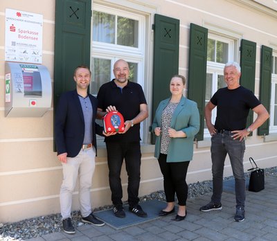 Kleines Gerät, lebenswichtige Wirkung: Das Haus der Musik in Gattnau ist ab sofort Standort eines öffentlich zugänglichen AED-Geräts. Vor Ort wurde im Rahmen des Projekts „Herzsicherer Landkreis Bodensee“ bereits das 146. AED-Gerät übergeben. Die Herzsicherheit im öffentlichen Raum am und um den Bodensee wird dadurch Schritt für Schritt immer weiter verbessert. Bürgermeister Daniel Enzensperger, Maria Persicke von der Sparkasse Bodensee, Willi Schmeh vom Unternehmen ‚DaS Immobilien‘ und Dietmar Engelhard als verantwortlicher Projektkoordinator der Björn Steiger Stiftung trafen sich vor Ort zur Übergabe und zur Bereitstellung des AED-Geräts.