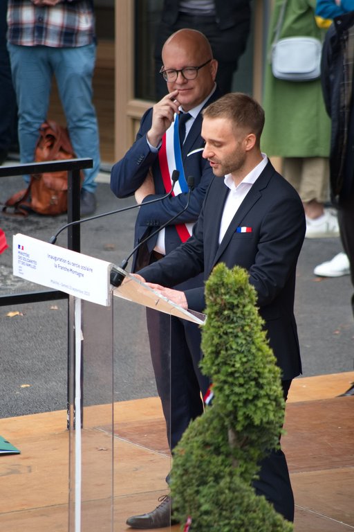 Dass es sich beim Schulneubau in Maîche um kein alltägliches Bauprojekt handelt, wird schon in der Architektur des Gebäudes sichtbar. Der kreisrunde Schulbau mit einem innenliegenden Schulhof ist ein Leuchtturmprojekt, das die Gemeinde Maîche gemeinsam mit der Fondation Pluriel umgesetzt hat. Die Fondation Pluriel ist eine Stiftung, die sich für die Inklusion von Menschen mit Behinderung, mit Suchterkrankungen oder in besonderen sozialen Problemlage einsetzt. Die neue Grundschule, die „Cercle Scolaire de Maîche“ ist zu 100 % inklusiv. Die Schule ist so gestaltet, dass sie also für alle Kinder, mit oder ohne Behinderung, zugänglich ist. Sie setzt damit neue Maßstäbe für die Konzeption von Schulgebäuden in Frankreich. Der besondere Stellenwert des Projekts wurde auch an der Rednerliste deutlich. Mit Fadila Khattabi war eigens die beigeordnete Ministerin für Menschen mit Behinderung aus Paris angereist, um Maîche zur neuen Schule zu gratulieren.