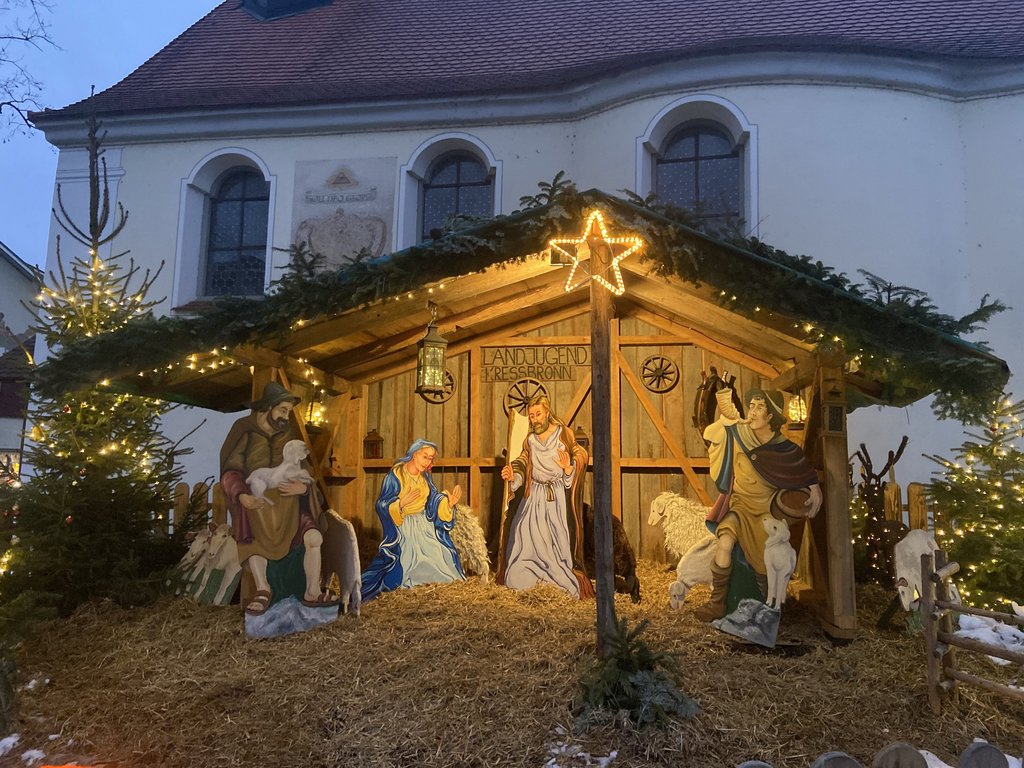 Die Feiertage stehen vor der Türe und so langsam schleicht sich Weihnachtsstimmung in den Alltag. Die Krippe der Kressbronner Landjugend an der Eligius-Kapelle trägt maßgeblich dazu bei, dass der Platz rund um Kirche und Rathaus in weihnachtlichem Glanz erstrahlt. Aufwendig gemalte Krippenfiguren von der Familie Kennerknecht, festlich geschmückte Christbäume und ein wunderschön gestalteter Stall lassen die Augen aller Besucher aufleuchten.