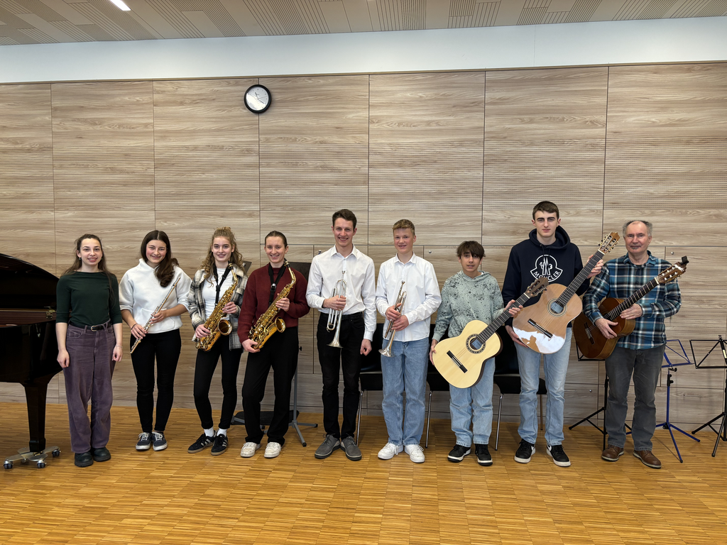 Die Wintermatinee, die in der Jugendmusikschule am 16. Februar nach der Kirche stattfand, war ein wahrhaftiges Fest der Musik. Die Schülerinnen und Schüler beeindruckten mit ihren großartigen Darbietungen, die das Publikum begeisterten und für eine stimmungsvolle Atmosphäre sorgten. Sophia Schreibmüller eröffnete das Konzert mit der "Aria" von Eugene Bozza auf dem Alt-Saxofon, wobei ihre präzise Technik und ausdrucksvolle Spielweise sofort das Publikum in seinen Bann zog. Es folgte Magdalena Heumesser mit der "Sonata a-moll" von Georg Friedrich Händel auf der Querflöte – ein virtuoser Beitrag, der die Feinheit und Tiefe des Barocks meisterhaft zur Geltung brachte. Tim Kuttenberger überzeugte mit der "Sonatina" von Anton Diabelli auf der Trompete. Sein Spiel war klar und präzise, die Melodien sprühten geradezu vor Leben und Energie. Ein weiterer Höhepunkt war der 2. Satz aus dem Trompetenkonzert von Johann Nepomuk Hummel, vorgetragen von Michael Heumesser, dessen brillanter Vortrag und das souveräne Spiel auf der Trompete beeindruckten. Das Gitarrenensemble mit Nico Haßler und Stefan Trippel rundete das Konzert mit drei meisterhaft interpretierten Werken ab. Die Harmonie der Gitarren klang warm und einladend und zog die Zuhörerinnen und Zuhörer in ihren Bann.