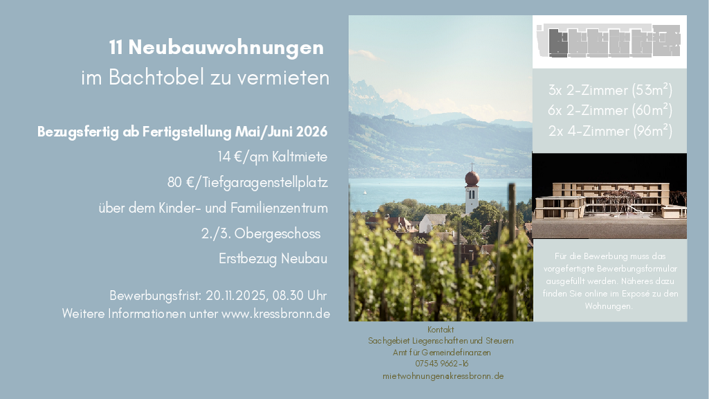 Die Gemeinde Kressbronn a. B. verfügt über eine begrenzte Anzahl an kommunalen Mietwohnungen, welche unter besonderer Berücksichtigung der Bewerberinnen und Bewerber mit Wohnsitz in der Gemeinde nach sozialen Kriterien vergeben werden. Zuständig für die Betreuung und Vergabe dieser Wohnungen ist das Sachgebiet Liegenschaften und Steuern im Amt für Gemeindefinanzen.