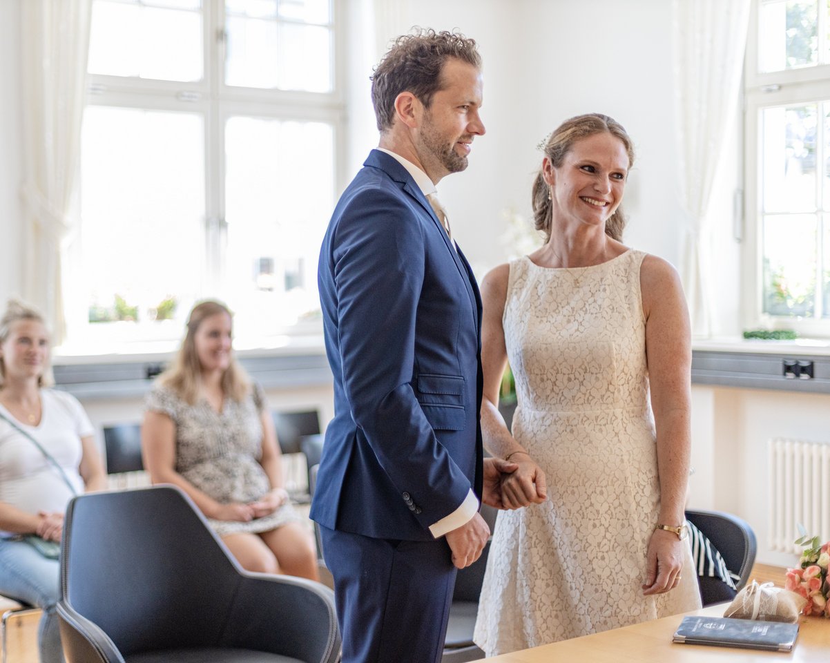 Standesamtlich können Sie ausschließlich in unserem Trauzimmer im Rathaus heiraten. Der Trauung geht ein Traugespräch, das sog. Aufgebot, mit dem Standesamt der Gemeinde voran. Wir erläutern Ihnen dabei die Rechte und Pflichten, die mit der Ehe verbunden sind und klären alle organisatorischen Fragen. Eine Broschüre zu Eherecht und Ehevertrag finden Sie unter "Downloads". Die Eheschließungen werden überwiegend von unserer geschäftsführenden Standesbeamtin vorgenommen.
