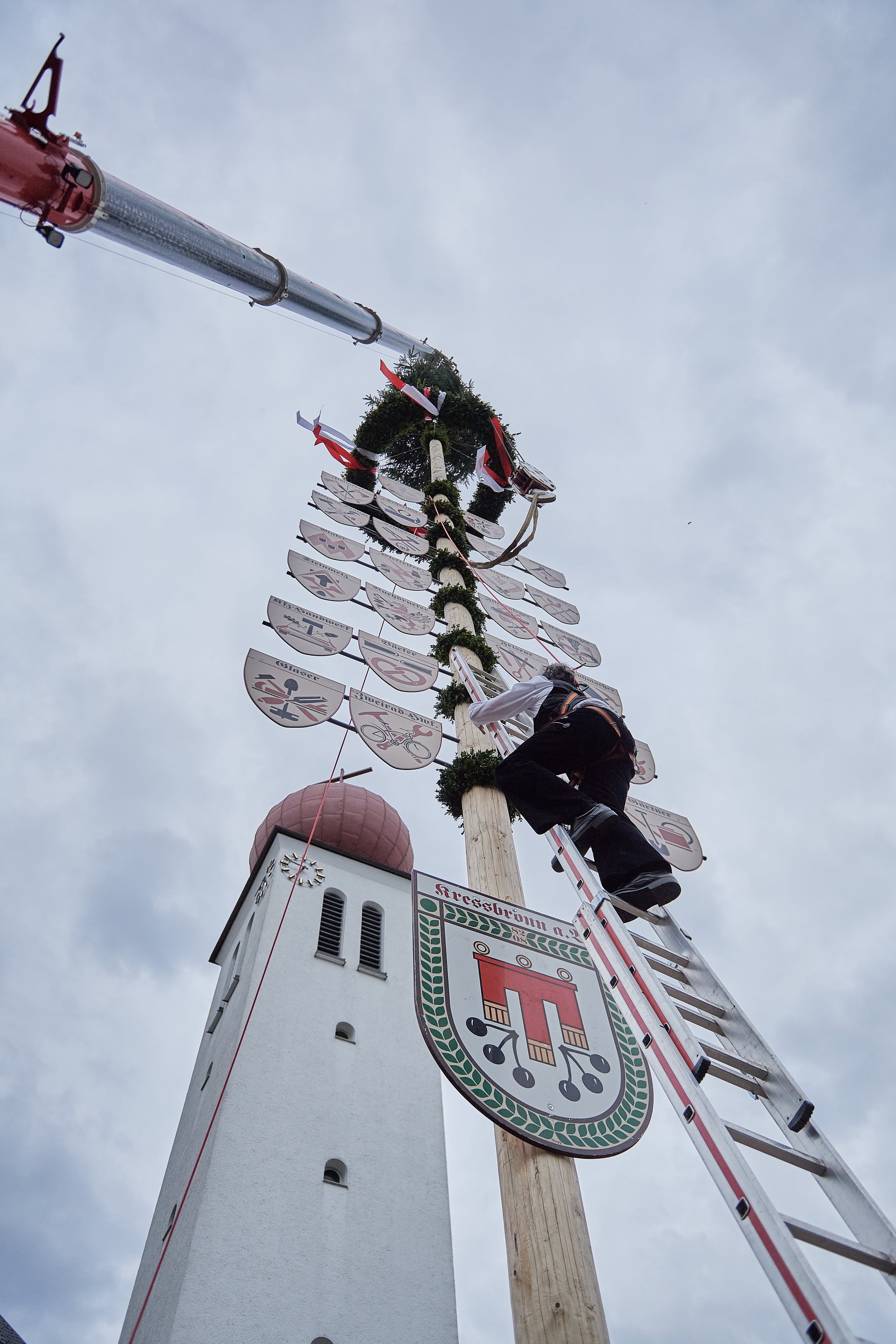 Die Aufstellungszeremonie wird musikalisch vom Musikverein Kressbronn e. V. begleitet. Da der Kressbronner Maibaum sehr groß ist, erfolgt die Aufstellung aus Sicherheitsgründen immer mit Hilfe eines Krans. Nach der Aufstellung des Maibaums wird traditionell gemeinsam das Lied „Der Mai ist gekommen“ gesungen und der Zimmermannsklatsch durchgeführt, bevor die Kressbronner Landjugend mit dem Kronen- oder dem Bändertanz aufwartet. Die Kressbronner Handwerkerschaft sorgt dann schließlich für das leibliche Wohl, so dass der Abend in gemütlicher Atmosphäre auf dem Rathausplatz ausklingen kann.
