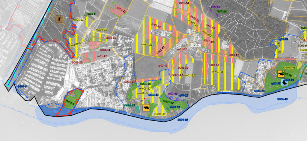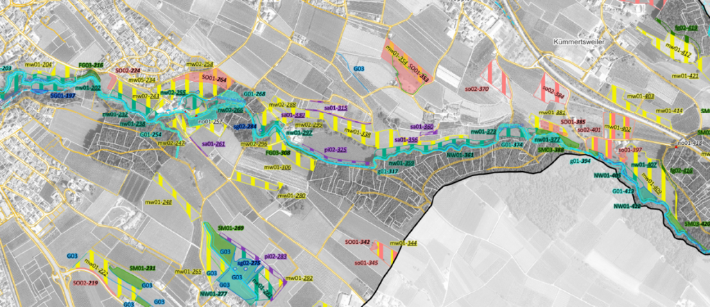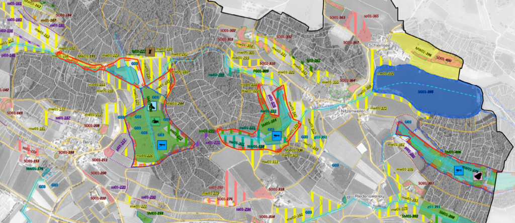 Mit Hilfe der Biotopkartierung und der FFH-Mähwiesenkartierung aus dem Jahr 2022 wurde auf Basis der Geländebegehungen ein Bestandsplan erstellt. Darin sind bestehende Kernflächen und Trittsteinbiotope dargestellt. Darüber hinaus lassen sich dem Bestandsplan Fundpunkte ausgewählter Zielarten wie beispielsweise die Gelbbauchunke, der Hirschkäfer oder der Kiebitz entnehmen. Diese wurden unter anderem durch Angaben von Gebietskennern ermittelt und bei der Entwicklung des Maßnahmenkonzeptes berücksichtigt.