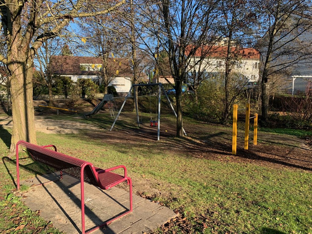 Der Spielplatz befindet sich im Ortskern direkt hinter dem Rathaus. Von der Bücherei kommend führt eine Brücke über den kleinen Bachlauf Fallenbach bis hin zum Spielplatz.Der Spielplatz ist von schattenspendenden Nussbäumen umgeben und bietet ausreichenden Sitzmöglichkeiten.