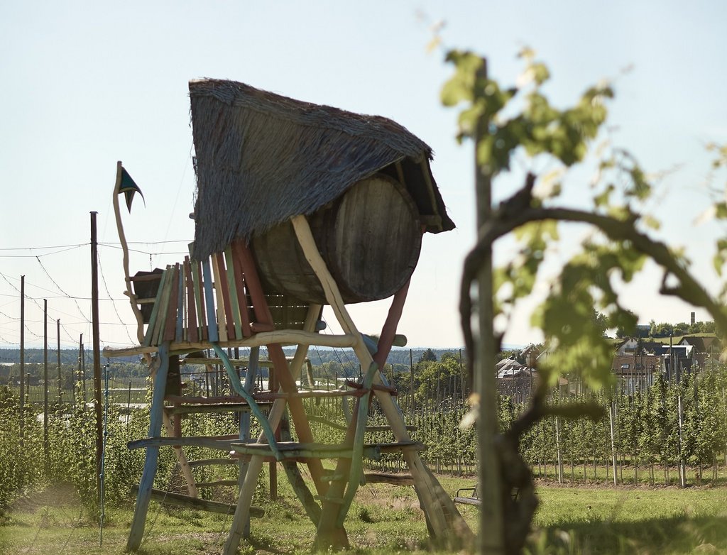 Kurz nach dem Startpunkt des Bauernpfades befindet sich ein kunterbunter Spielturm. Dieser wurde überwiegend aus Naturmaterialien wie Holz gefertigt. Highlight der Turmkonstruktion ist das integrierte Weinfass, in das die Kinder hineinklettern können.